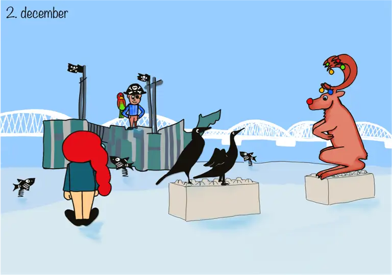 ”Ohøj”, lyder det højt oppe fra en mast. Det er en pirat, der råber ned til dem. ”Hvad bringer sådan et par landkrabber her til mit skib?”