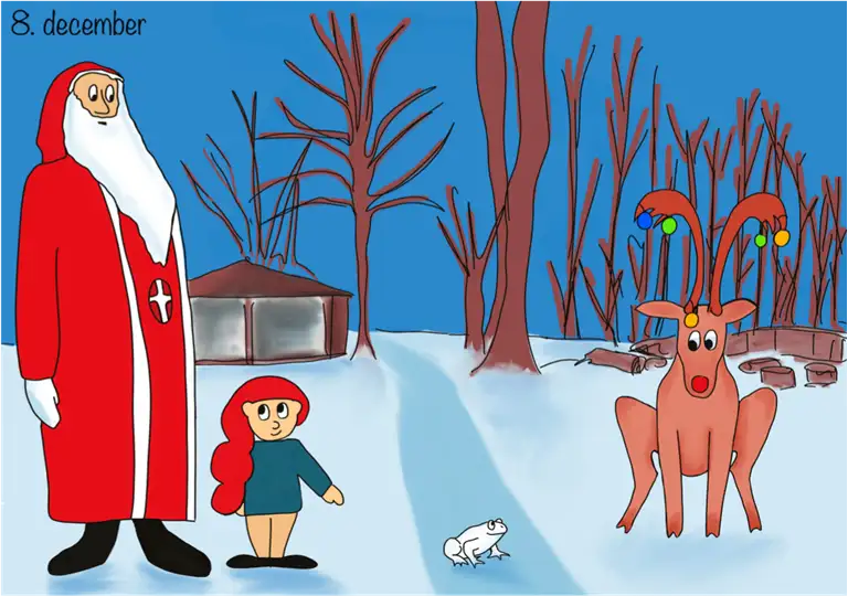 ”Det er en ganske særlig snefrø.” Den meget store nisse bøjer sig og aer forsigtigt frøens hoved med sin pegefinger.” Men jeg ved ikke, hvor den kommer fra.”